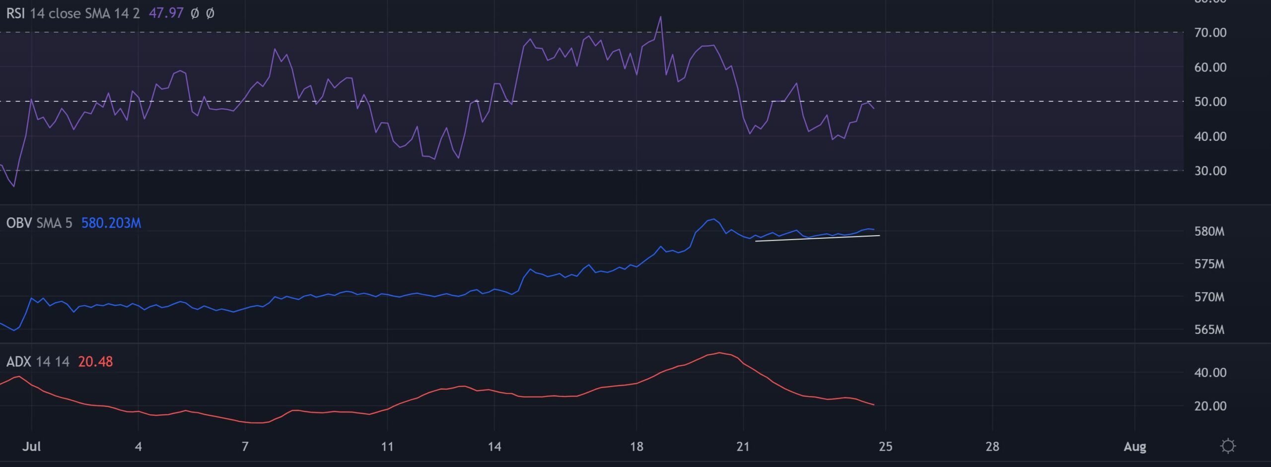 Nevertheless, the OBV maintained its slightly higher troughs and thereby affirmed a bullish divergence with the price action. But the ADX displayed a considerably weak directional trend for the alt.