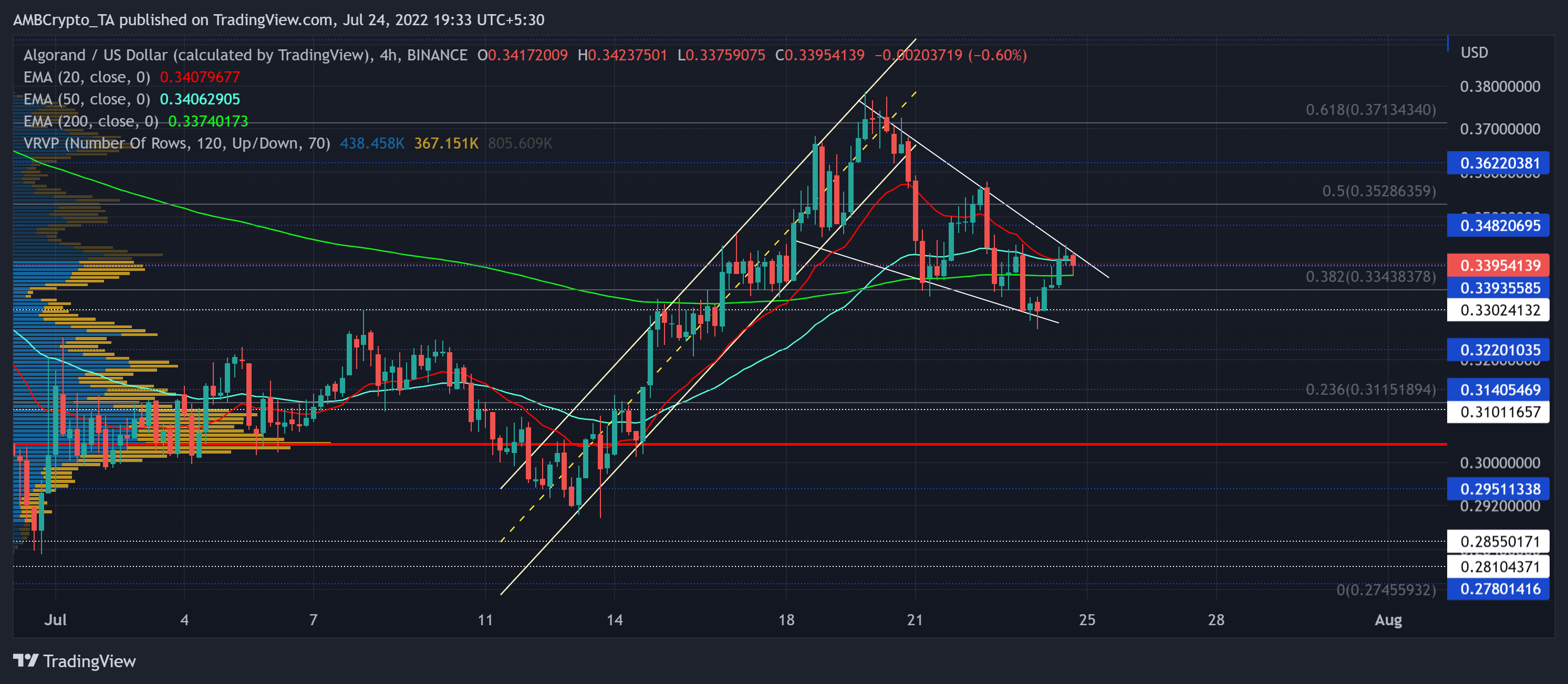 Looking at the falling wedge setup approaching the $0.33-support, ALGO could see a revival. In this case, the potential targets would remain the same as discussed. However, any bearish crossovers on the EMAs can delay buying endeavors.