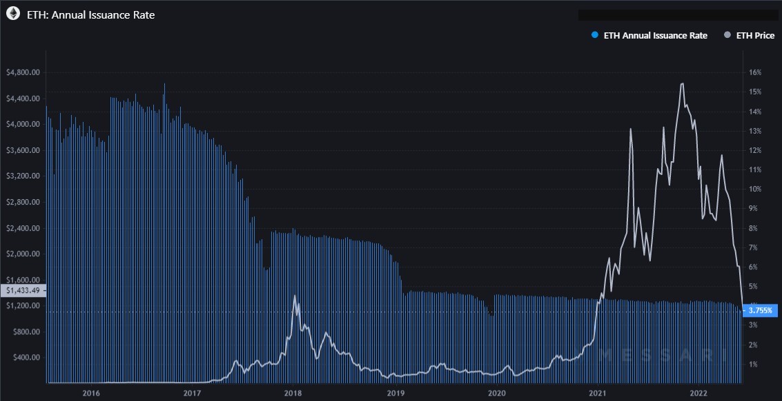 It’s estimated that the daily issuance will drop from 15K ETH to about 1.5 ETH when the Merge is completed. This will cause a drastic drop in the yearly issuance rate to below 1%, and, in the longer term, it may drop to below zero.