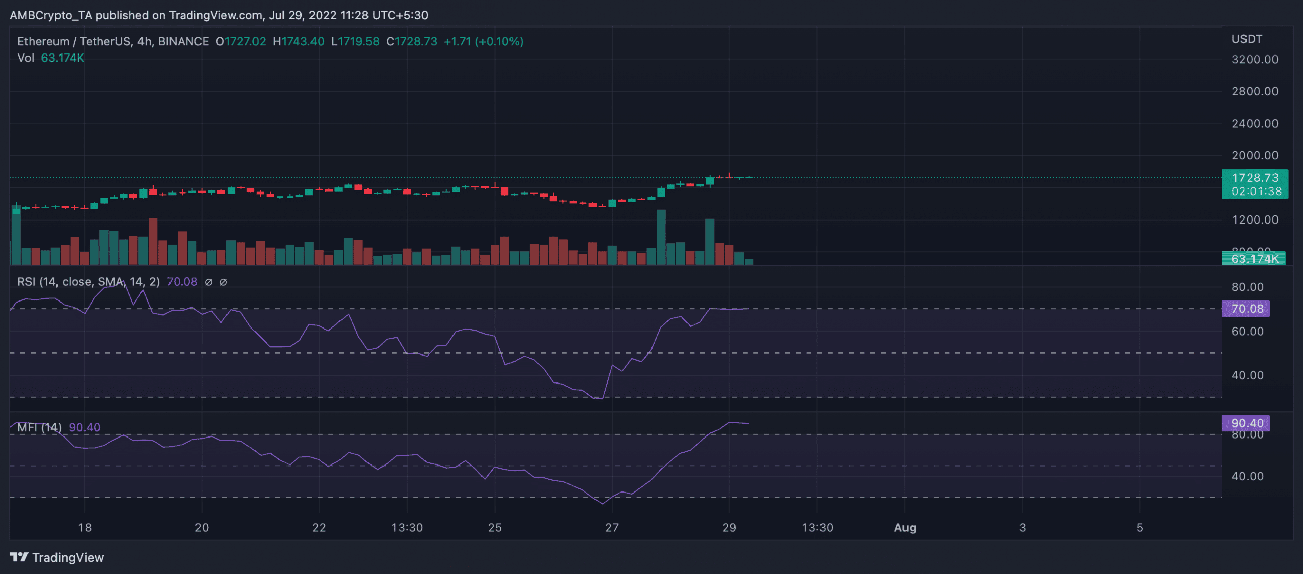 On the four-hour chart, the ETH coin was severely overbought. The token’s Money Flow Index (MFI) was spotted in an uptrend at 90.40. Similarly, its Relative Strength Index (RSI) maintained a position at 70.08 index.