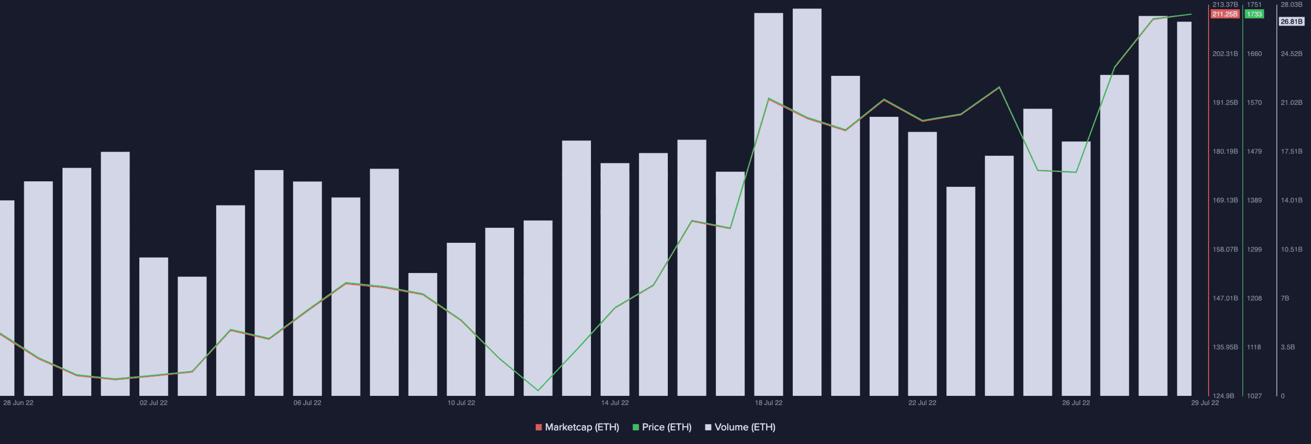 The price of the leading altcoin, Ethereum [ETH], traded above $1,770 during the intraday trading session on 28 July. The last time that the altcoin reached this price was on 10 June.