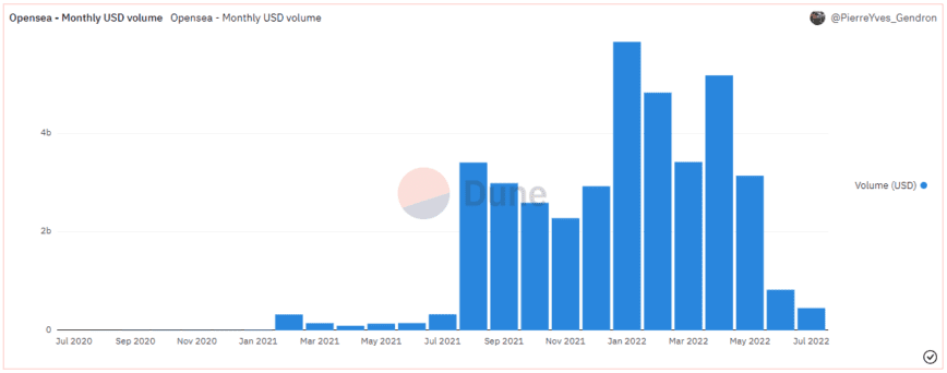 According to Dune data compiled by PierreYves_Gendron, OpenSea’s trading volume hit a peak of around $5.8 billion in January. However, trading on the platform has steadily declined throughout the first two quarters of the year, sliding to $3.1 billion in May. June saw the most significant drop in the exchange’s history compared to earlier months as trading volumes plummeted 74% to $826 million. Extending the slide, OpenSea has seen $456.9 million so far this month with four full days remaining.