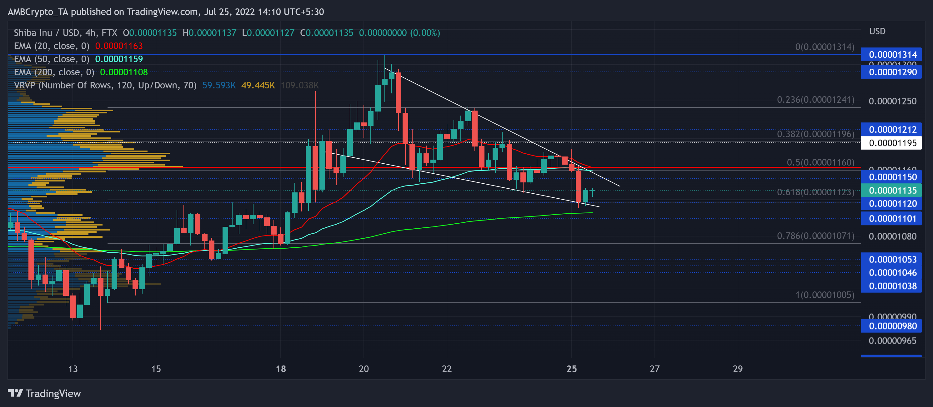 Recovery from the 61.8% support level could provide the bulls a much-needed force to invalidate the bearish tendencies. Any drop below this level or the 200 EMA (green) would ignite shorting signals. In this case, the targets would lie in the $0.01053-mark.
