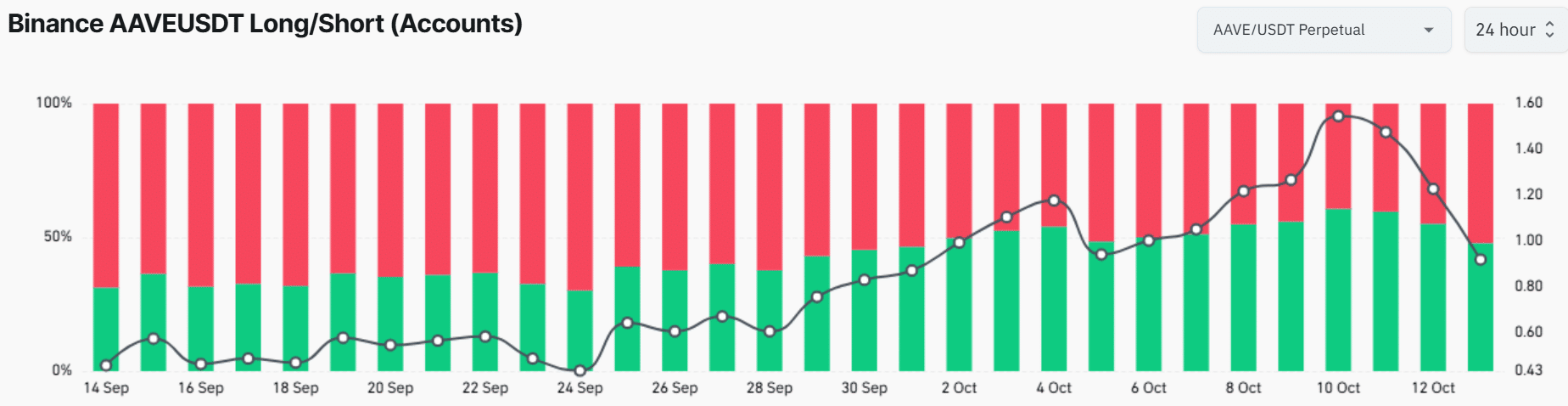 On Binance, the accounts taking long positions have dropped drastically, from 60% to 47%. At the same time, short accounts on AAVE have increased from 39% to 52%.