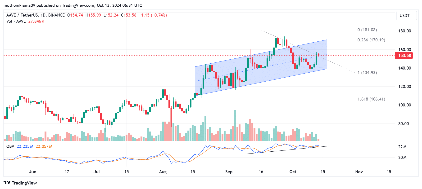 For AAVE to break out above the ascending channel and confirm the bullish thesis, it needs to overcome resistance at the 0.236 Fibonacci level ($170).