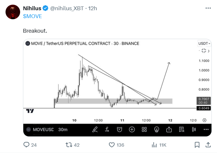 While high volatility has hit leading cryptocurrencies in the wider market, the $MOVE token has gained interest among crypto investors due to its outlook on its ecosystem. Influencers such as @nihilus_XBT and @CryptoProject6 have shown optimism in the future direction of $MOVE.