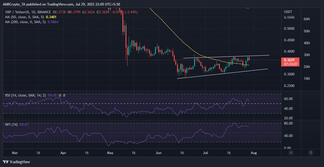 XRP has been stuck in a ranging performance since mid-June. It traded at $0.363 as of 29 July, which is a slight improvement from its current 2022 lows.