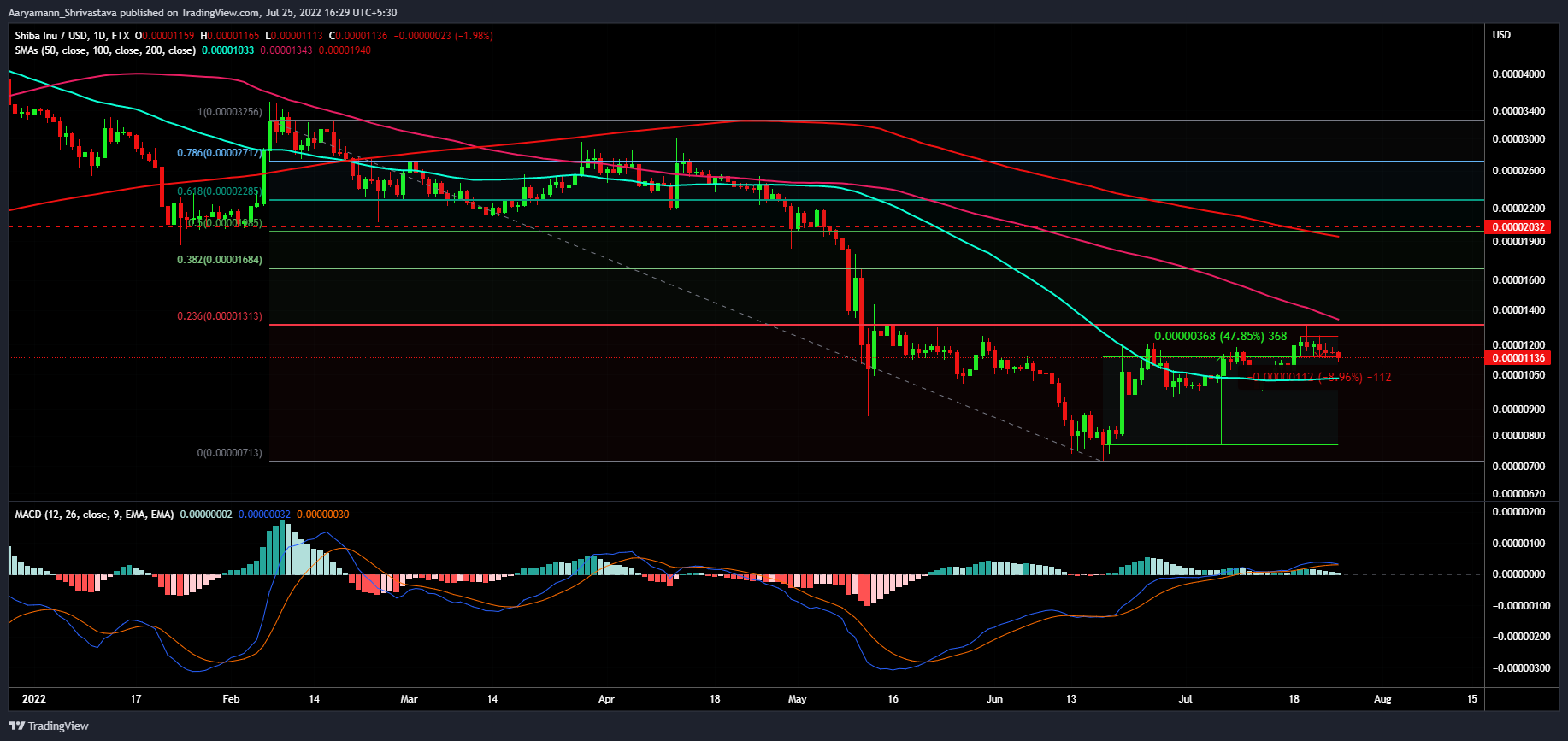 Testing the 23.6% Fibonacci level as resistance, the altcoin traded under the $0.00001300 level.