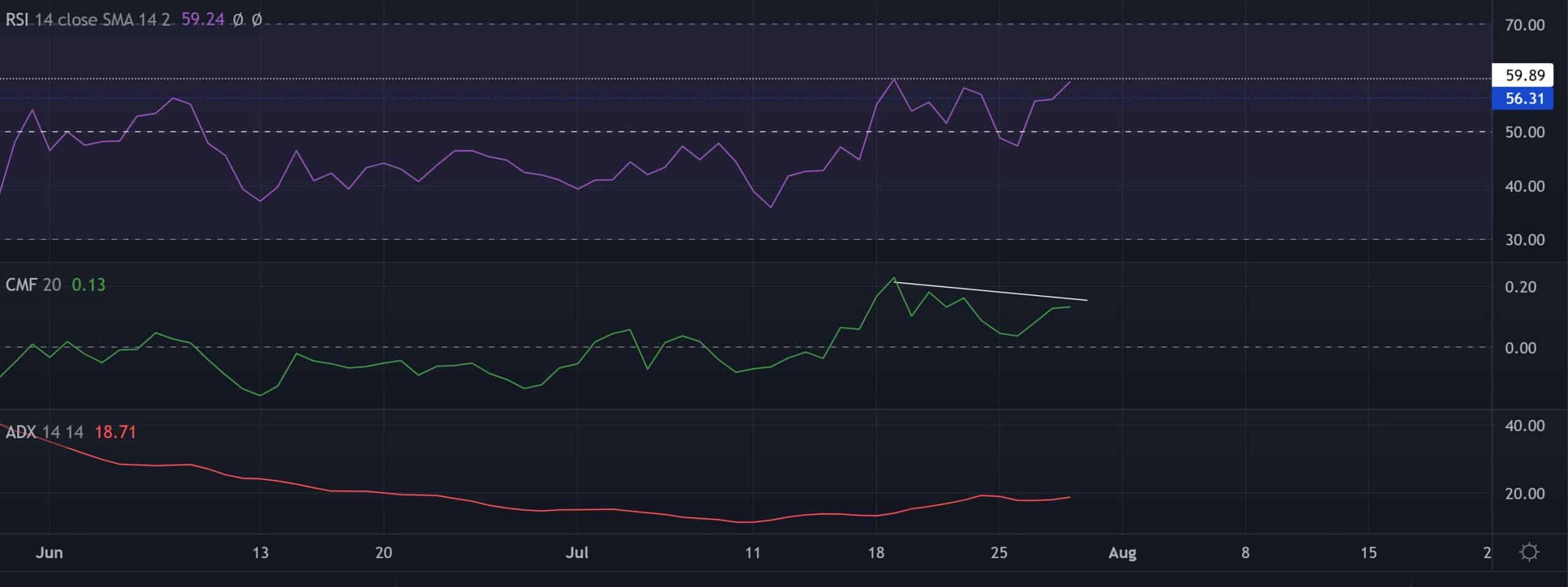 The Relative Strength Index (RSI) took a relatively bullish stance while retesting the 59-mark resistance. A breach above this mark could aid the buyers in finding fresher highs.