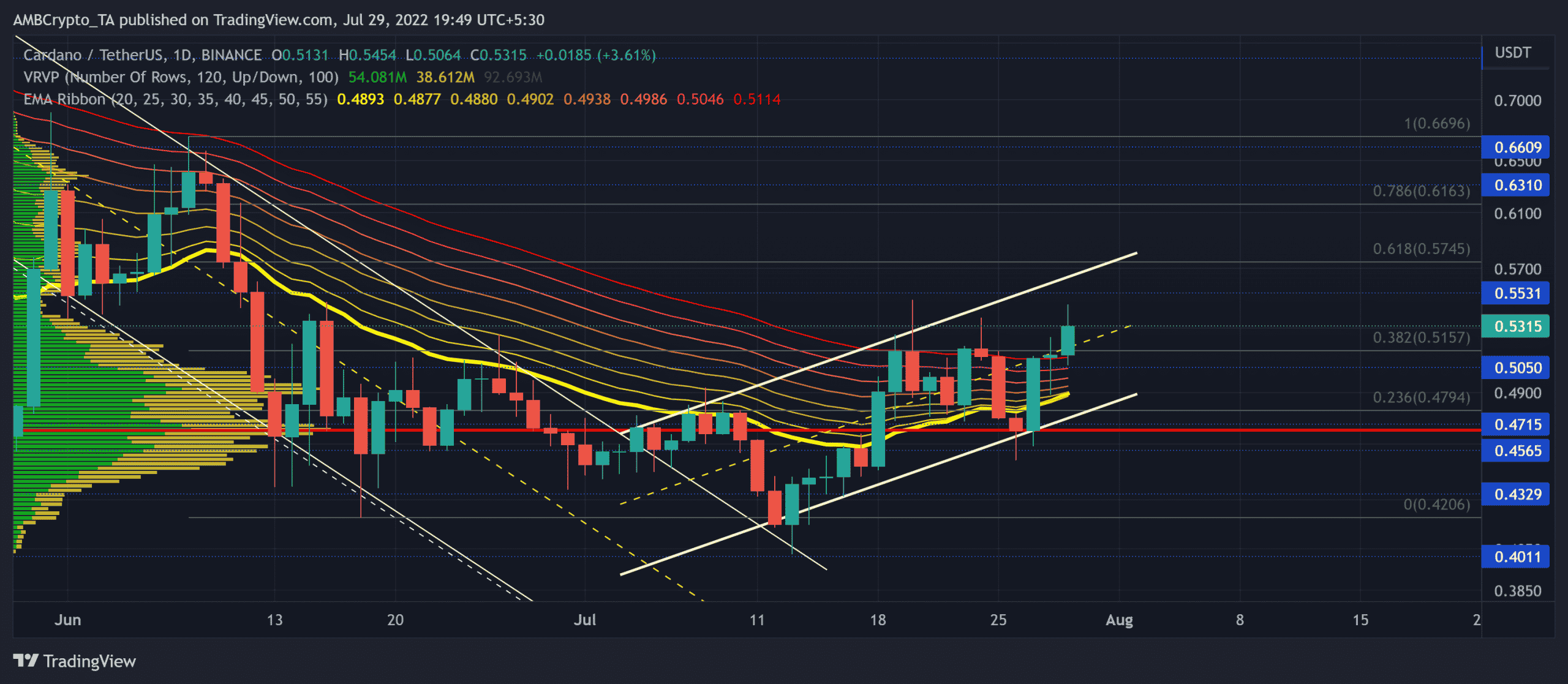 But with the breach of the 38.2% Fibonacci level, buyers could strive for more before giving in to the reversal tendencies of the pattern. At press time, ADA traded at $0.5315, up by nearly 7.52% in the last 24 hours.